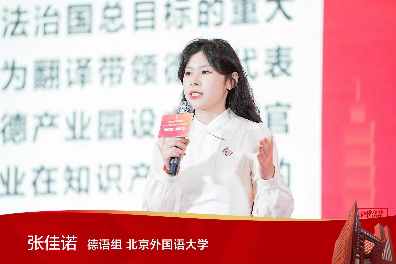 12月8日下午,大赛闭幕式设置了“多语种组冠军展示”特别环节,各语种国赛冠军用自己的参赛外语,结合学习经历与参赛所得,讲述自己理解中国、沟通世界的故事,展现当代青年的风采。张佳诺同学结合自己不久前带领德国代表团参观北京顺义中德产业园的经历,分享了自己从《理解当代中国》系列教材中学习到的中国依法治国理念以及中国法治建设成就的故事,获得了一致好评。